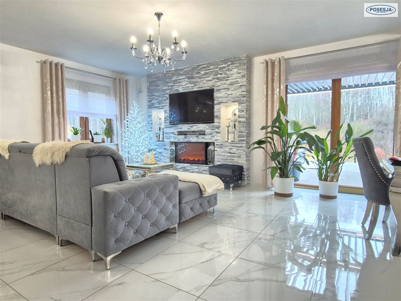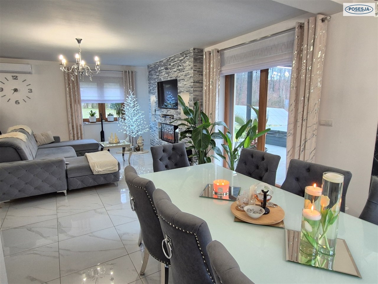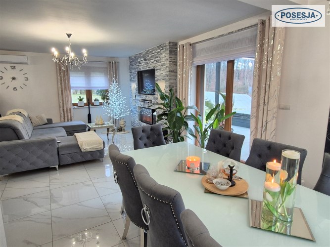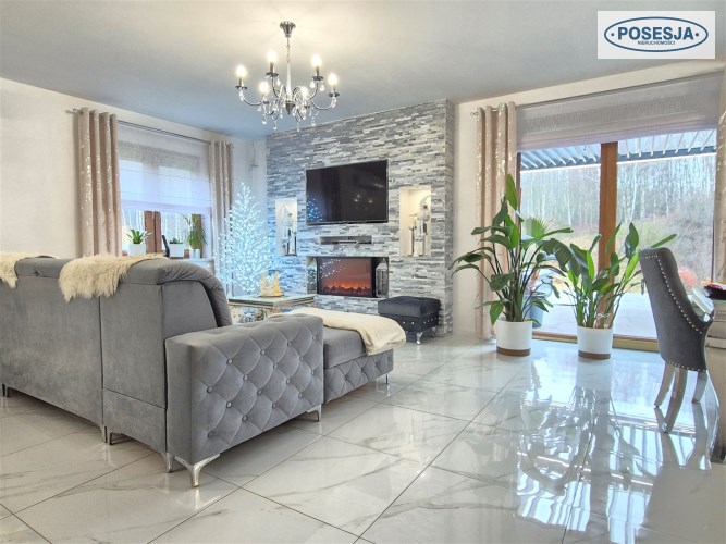 - duży salon z wyjściem do na taras z jacuzzi i widokiem na las,