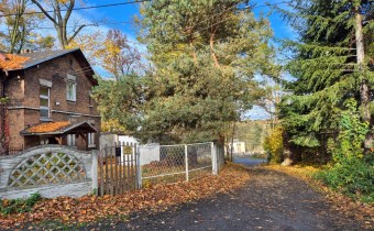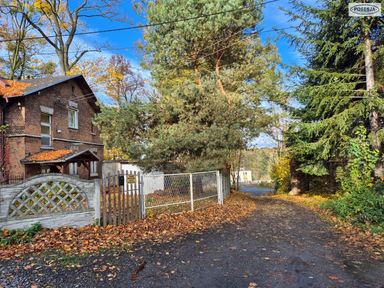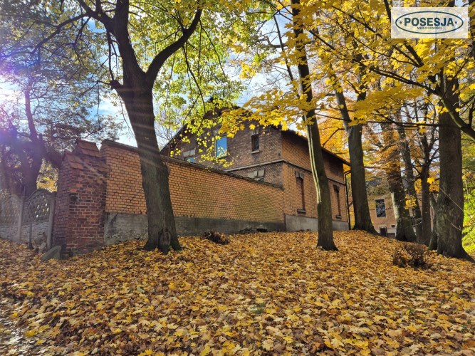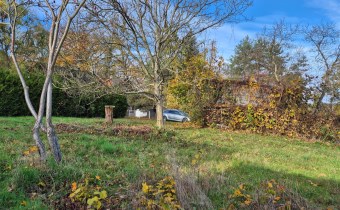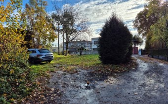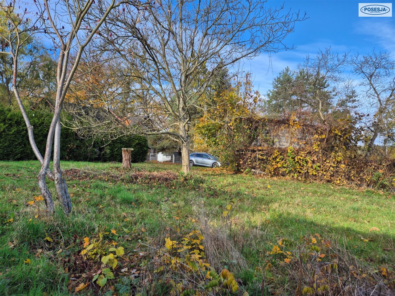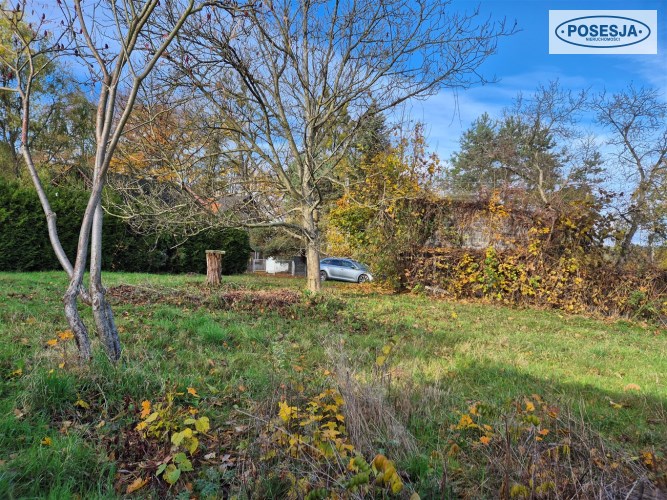 Działka o powierzchni 1438 m2 jest paska, częściowo ogrodzona porośnięta kilkoma drzewami.