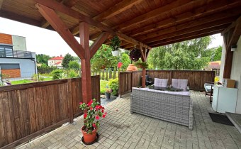 Taras z meblami ogrodowymi – idealny do wypoczynku.