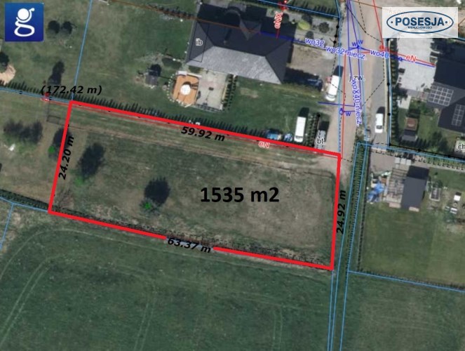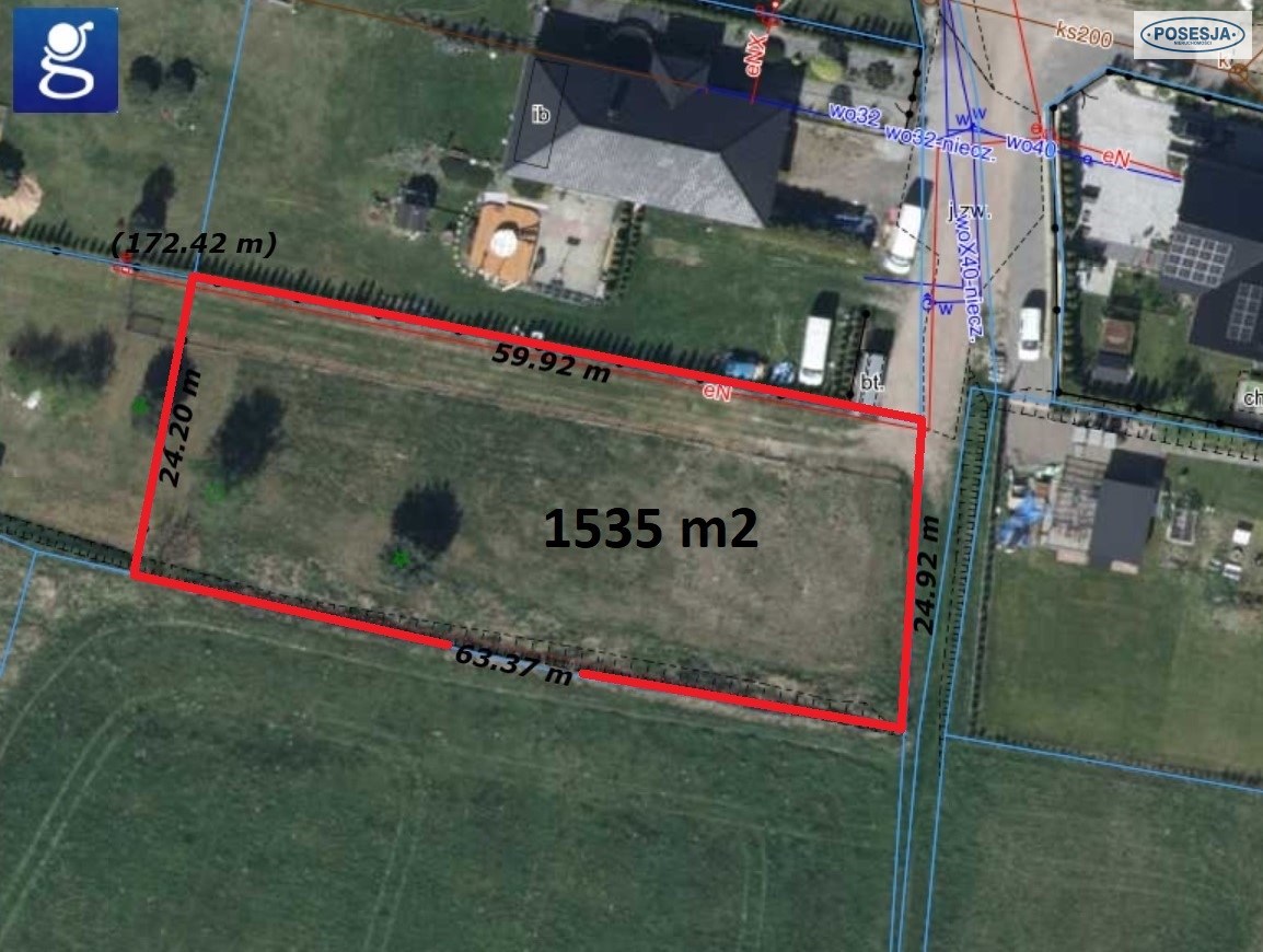 Działka o powierzchni 1535m2, w kształcie prostokąta o wymiarach 24(25)m x 60(63)m.