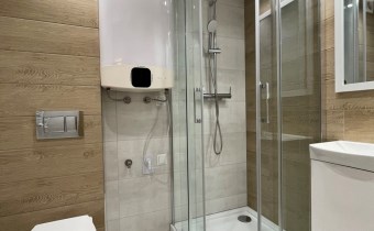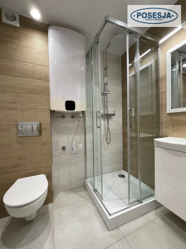 Nowoczesna łazienka z kabiną, prysznicową zapewnia komfort, dodatkowo łazienka wyposażona w pralkę.