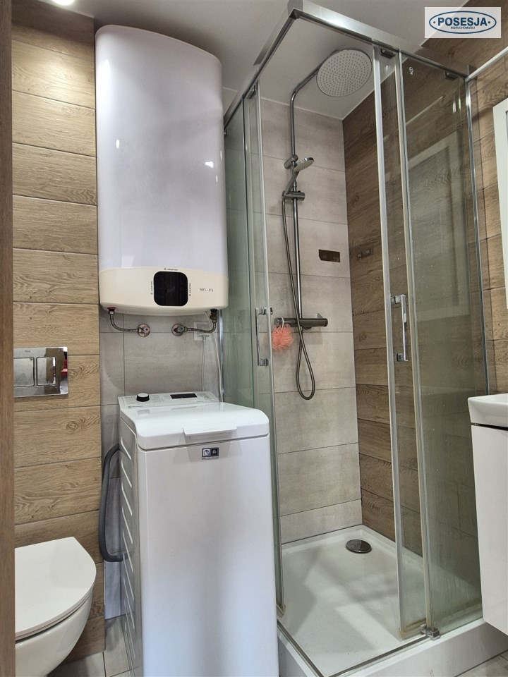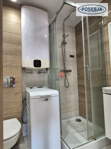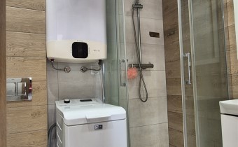 Nowoczesna łazienka z kabiną, prysznicową i pralką.