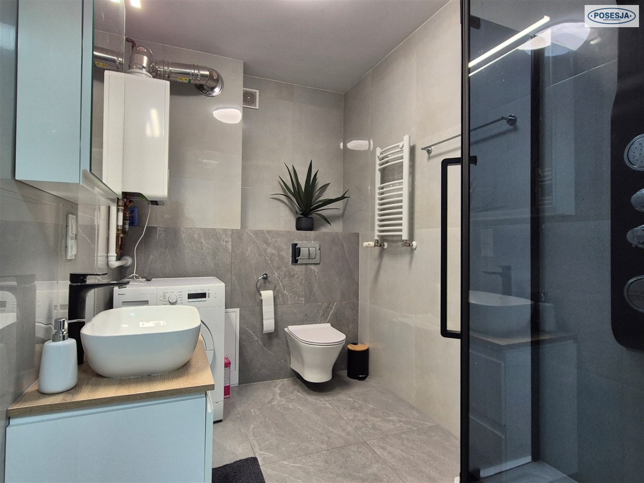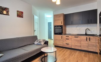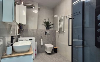 Mieszkanie położone w nowo wybudowanym bloku, gotowe do wprowadzenia, umeblowane i wyposażone (lodówka, płyta elektryczna, piekarnik, zmywarka, w łazience pralka), pokój dzienny z telewizorem, sypialnia z podwójnym łóżkiem oraz dużą szafą.