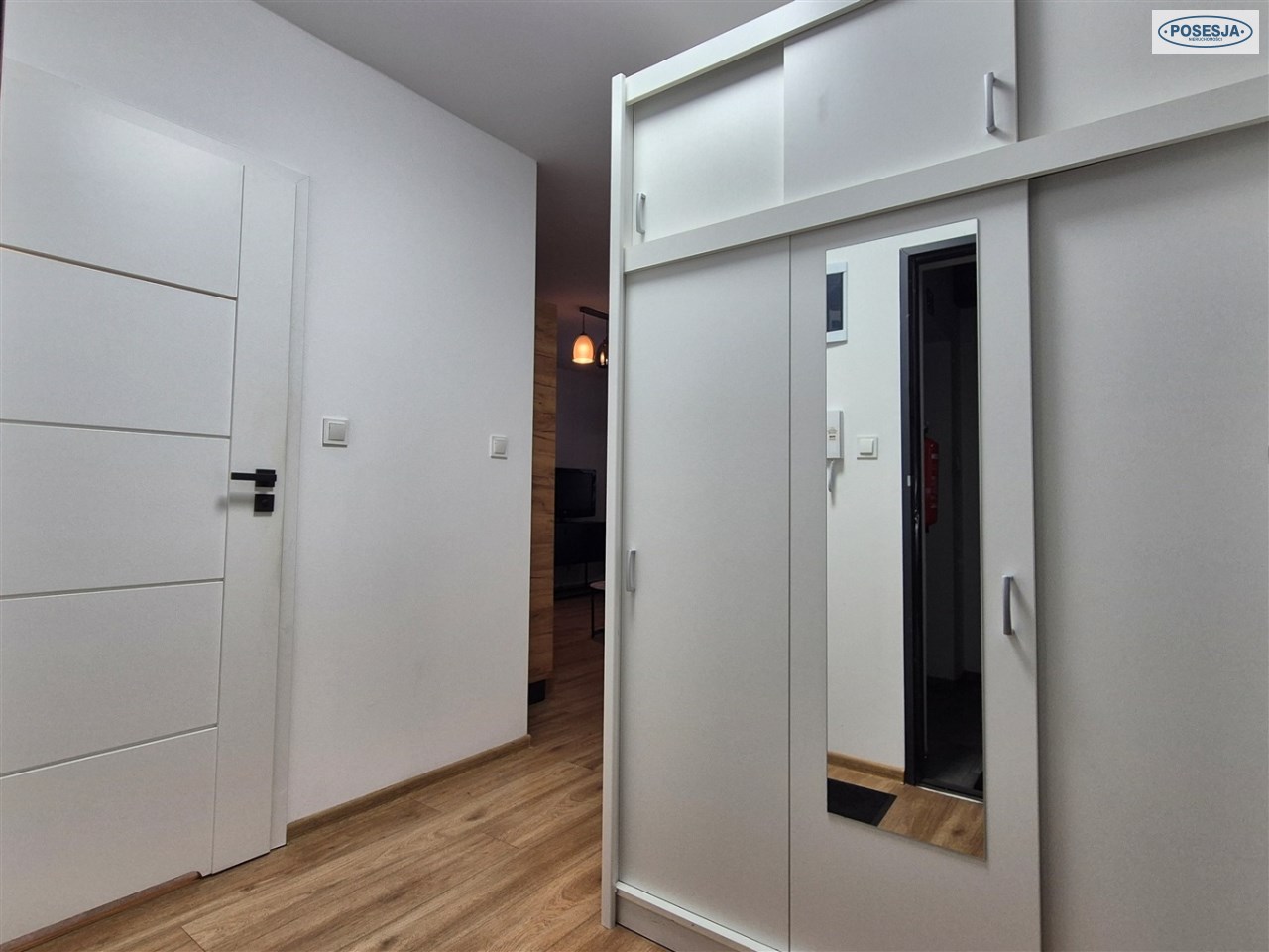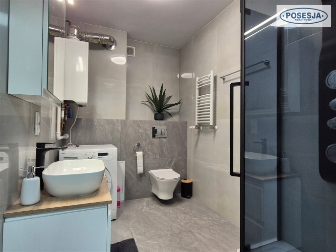 Mieszkanie składa się z pokoju dziennego, osobnej sypialni, aneksu kuchennego, przedpokoju z zabudowaną szafą oraz łazienki z prysznicem i pralką.
